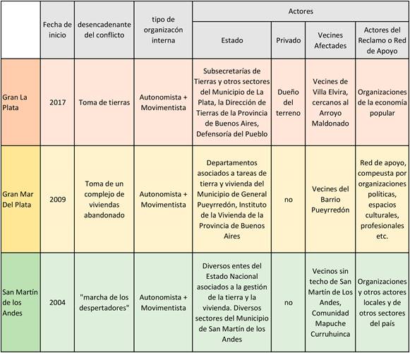 En este apartado se profundizará en el análisis de lo anterior, procurando comprender similitudes y diferencias en cada proceso. La búsqueda de estas coincidencias pretende detectar patrones en torno a dificultades y oportunidades que se les pueden presentar a quienes entablan disputas en pos de conseguir mejores condiciones de habitabilidad. Cabe mencionar, que no es el objetivo de esta sección, ponderar un caso por encima de otro.