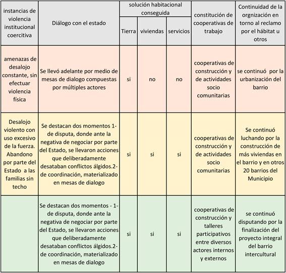 El análisis realizado, permitió comprender las causas que dieron origen a cada caso, el rol de los diversos actores involucrados, las variables que ayudaron a les vecines a resolver sus urgencias habitacionales en forma colectiva y las estrategias que estos se dieron para mantener su organización posteriormente, llegando a apoyar procesos de lucha por el acceso al hábitat digno de otras comunidades.