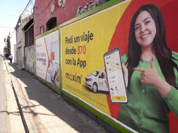 Pero, a diferencia de su par estadounidense-neerlandés, Maxim articularía una mayor presencia territorial a través de campañas de marketing en la vía pública (Tabla 2) y buscaría gestar alianzas como forma de institucionalización. Para ello emitió comunicados en medios regionales sobre la legitimidad de la actividad, intentó integrar a taxistas (como también buscó Uber), incorporó promotores locales, difundió en social media códigos promocionales y beneficios para referidos; estableció sistemas de reciprocidad con pequeños comerciantes para anuncios y redujo costos para socias/os que se identificasen con vinilos de la empresa; al mismo tiempo, no dejó de promocionar viajes a precios bajos en comparación con las tarifas locales. En estos pasajes se advierte, siguiendo a Pollio (2021), que las plataformas llevan adelante múltiples y detalladas adaptaciones de vías y espacios públicos. Tal es el caso de la territorialización de estos servicios que implican una renegociación permanente en los límites de lo lícito (no exenta de disputa, como se ve en la vandalización de la publicidad callejera). En ese sentido, la plataformización no se trata nunca de un proyecto completo y abre lo que Graham (2020) llama una geografía coyuntural en la cual la inscripción en relaciones situadas y contextualizadas es paralela a un desapego de la vida urbana que les permite evitar constricciones y responsabilidades locales cuando despiertan polémicas.